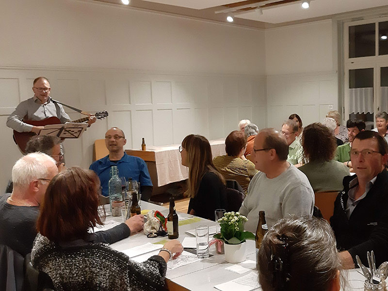 37 Personen fanden den Weg ins Restaurant Schuel Au zum offenen Singen mit Dani Stamm. Zur Begrüssung erklärte Marlies Moser, dass es wissenschaftlich erwiesen ist, dass das Singen einen gesunden und positiven Einfluss auf unser Wohlbefinden hat.